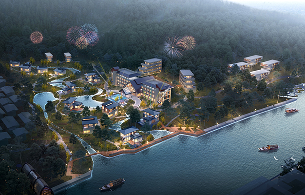 杭州千岛湖希尔顿酒店依陡峭的山体,临湖而建。湖水随着季节的更替,水位相差数十米左右。在建筑规划中,由七座楼宇形成一个整体,其间楼宇的朝向与功能都不一样,而且酒店的大堂入口面山而建,山体的竖向结合景观的竖向进行考虑,亦减少对山体的破坏。较陡峭的区域设计了亲水的草坡,比较平缓的区域设计了梯级的草阶,多处山体地形亦按景观的建议进行修整。