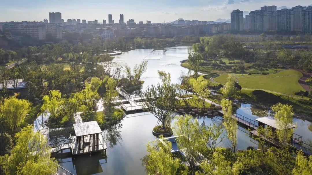 本案作为上饶槠溪河生态走廊规划十景之一,靠近南侧城区,因此定位为城市活力公园。立足于道教、山水、诗词等地域文化,以“溪畔时光·秀美纷饶·乐享逍遥”为主题,以逍遥思想为脉,串联五大板块。场地呈环水的河心岛形态,依托现状河道资源引水入园,建设活力四射的市民亲水后花园。十里槠溪水,跨越漫长的时光,将悠久的饶城历史延续至今。